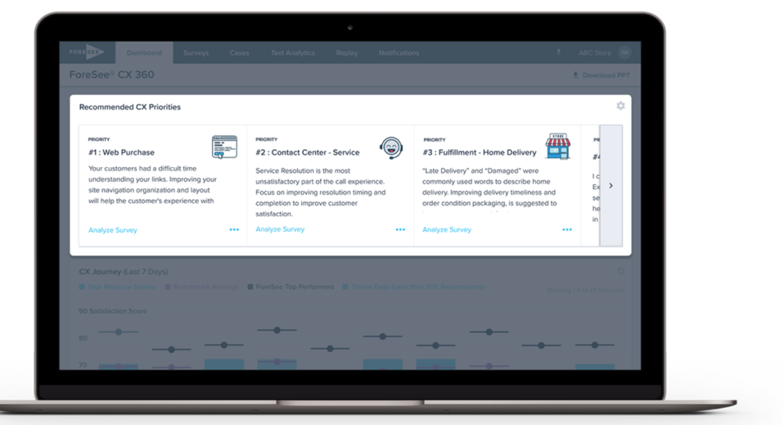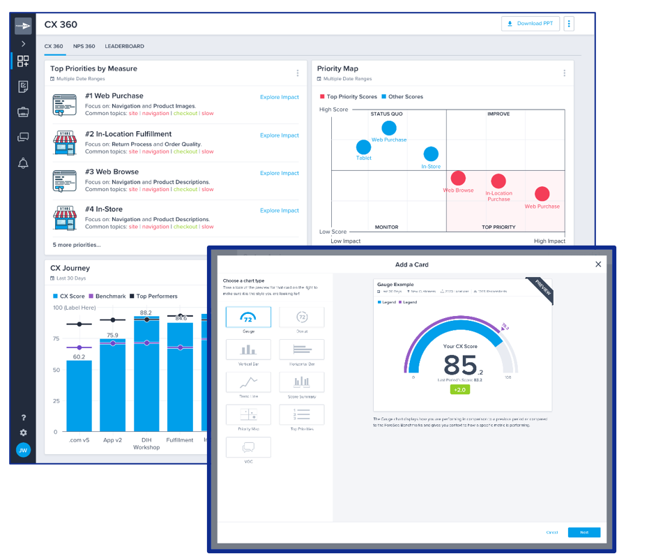 The solution's patented Priority Index calculates experience scores across touchponts and then rank them by lowest score and highest impact. The quick, intuitive visualization can be helpful to detect sudden changes in CX performance and knowing where to focus first.